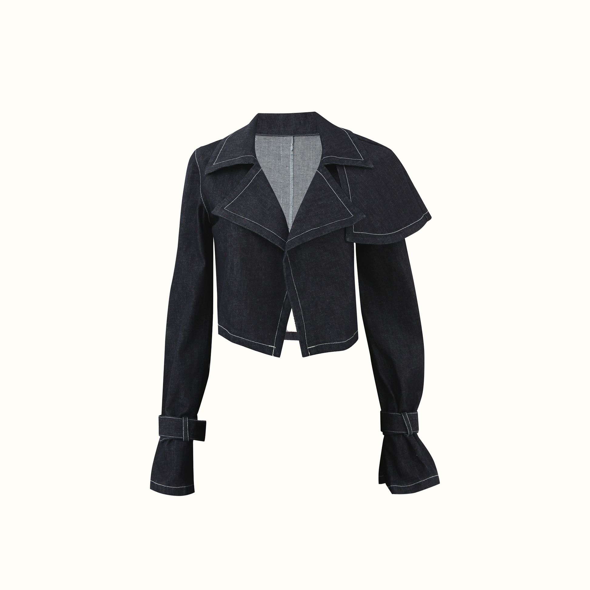 Not your typical Denim Jacket. With this item, we are paying homage to the history of the timeless trench coat yet still keeping it modern. This cropped trench piece has a more playful approach with a delicate essence. A symmetric classic collar, and a hemline with one side longer than the other, achieve the perfect classic look but the LUCE way. The oversized gun flap on the left shoulder gives it character and a significant touch.
